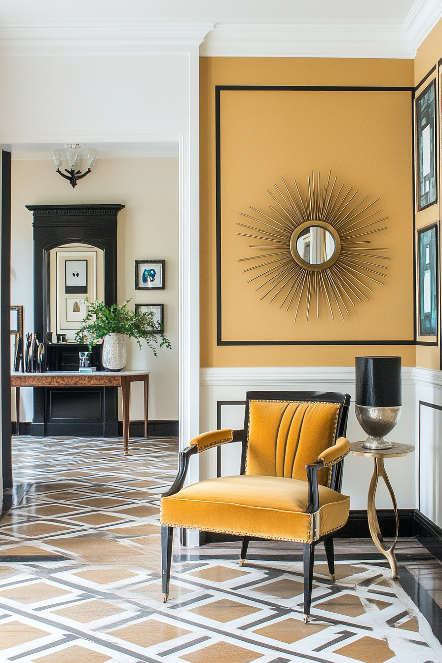 Geometric patterns are a hallmark of Art Deco design. Use wallpaper with bold geometric designs in metallic shades or deep colors to create a striking feature wall. If wallpaper isn’t your style, consider painting geometric patterns directly onto your walls. This can be a fun DIY project that allows you to customize the design to your liking.