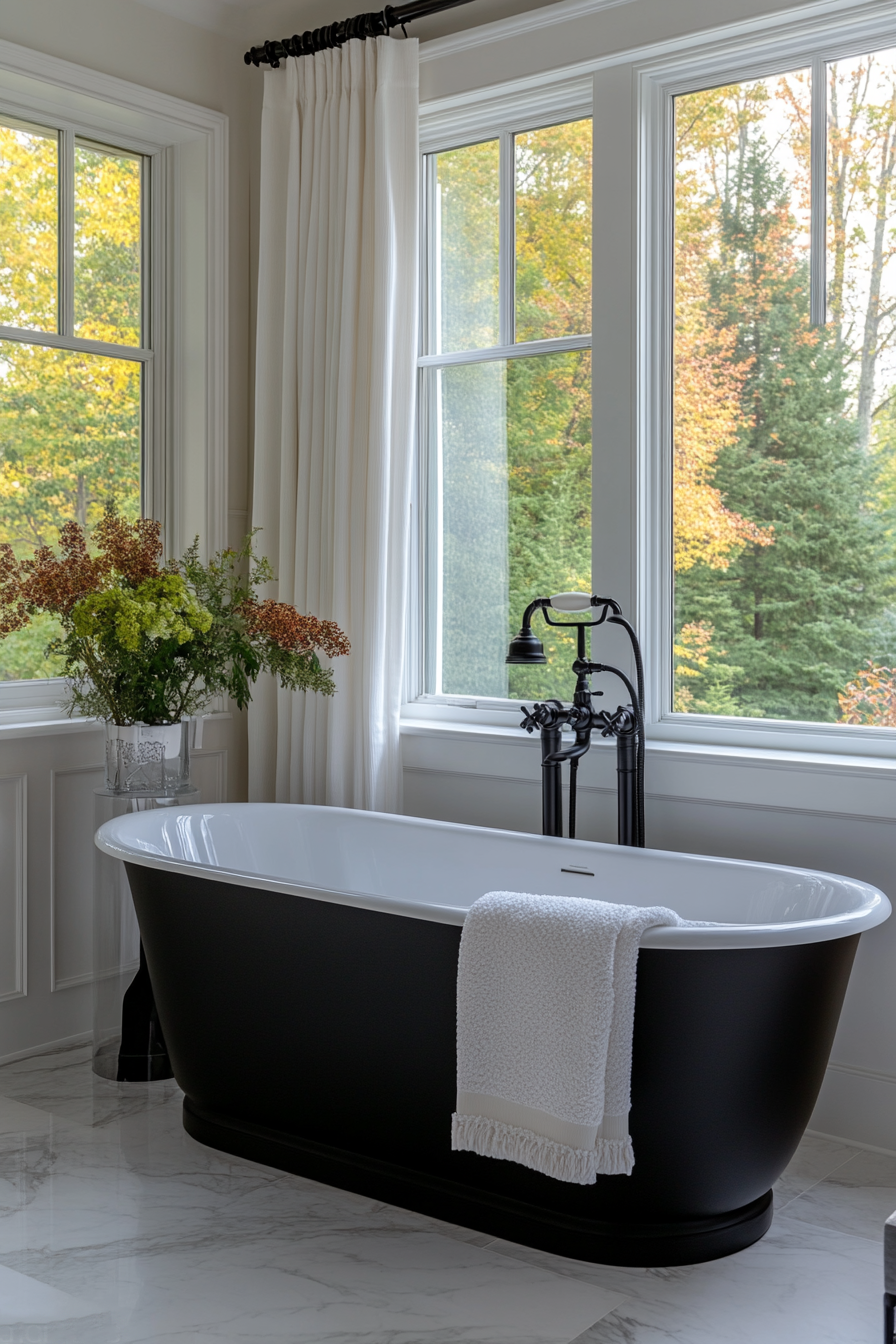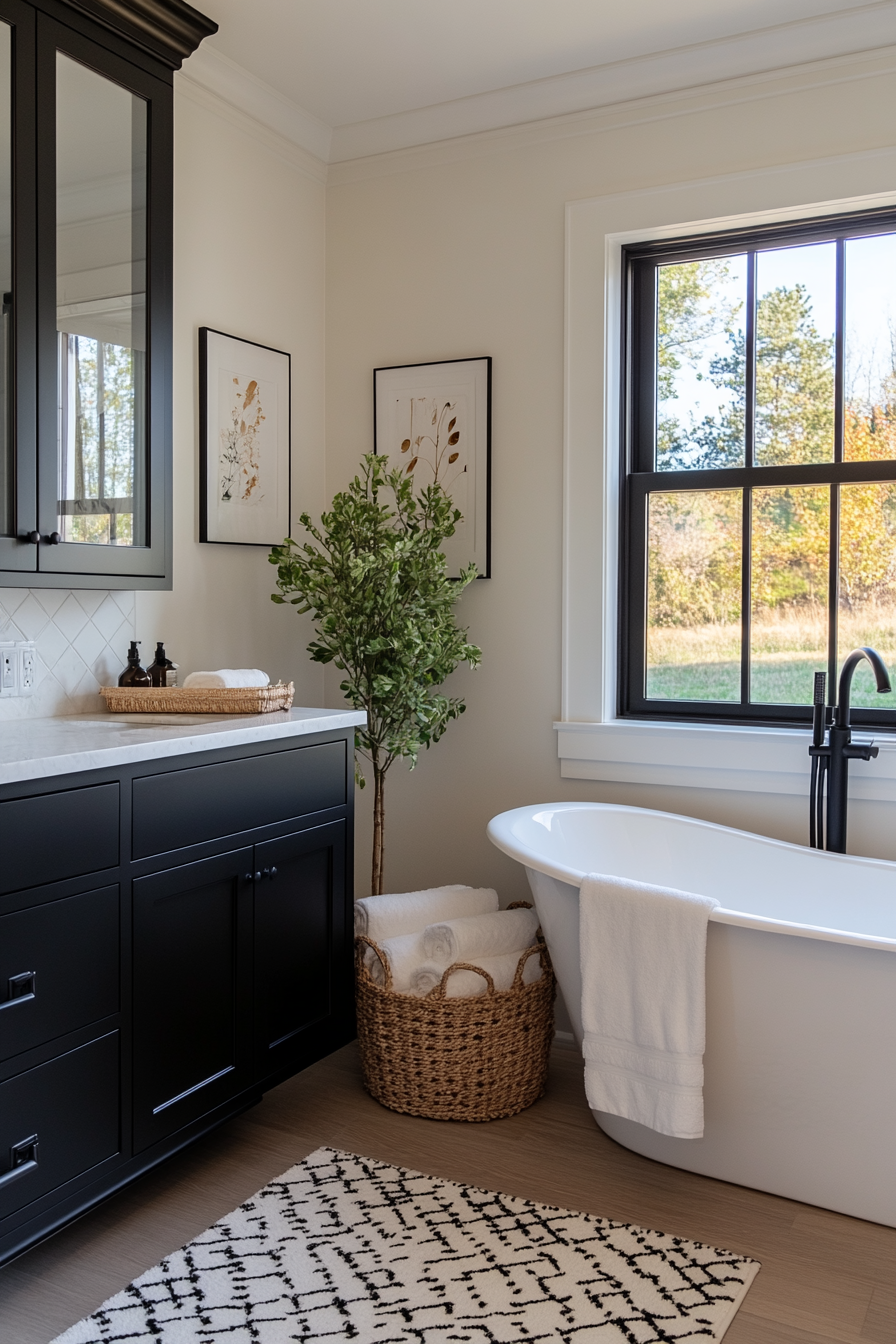 Embrace the classic black and white palette for a bathroom that feels both timeless and modern. This color combination never goes out of style and can be easily updated with new accessories and details. Begin with a base of white walls, which provides a clean and fresh canvas, and introduce black elements through fixtures, cabinetry, or even a bold accent wall.
