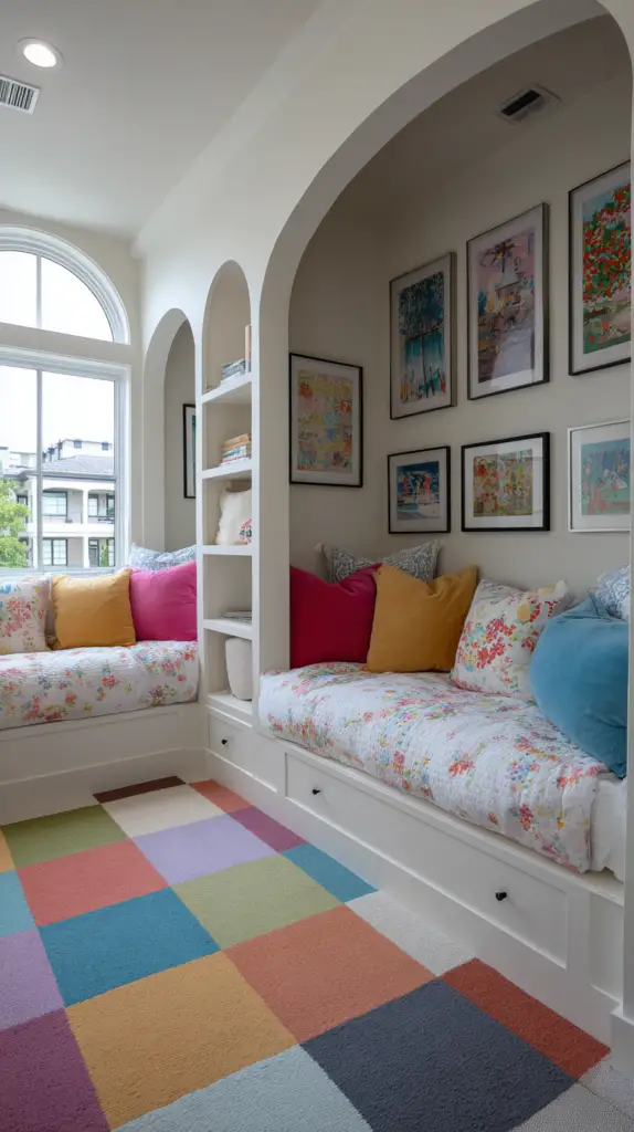 This idea works well for smaller rooms where every square foot matters. The nooks can also double as hideaways or play areas when not being used for reading. A simple light fixture or touch-activated lamp ensures the space remains well-lit and functional.