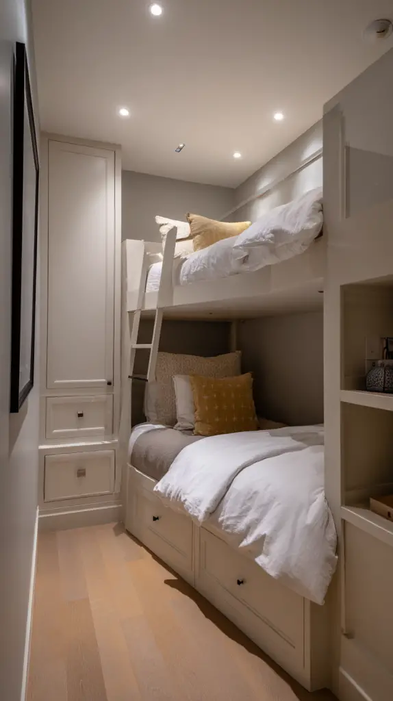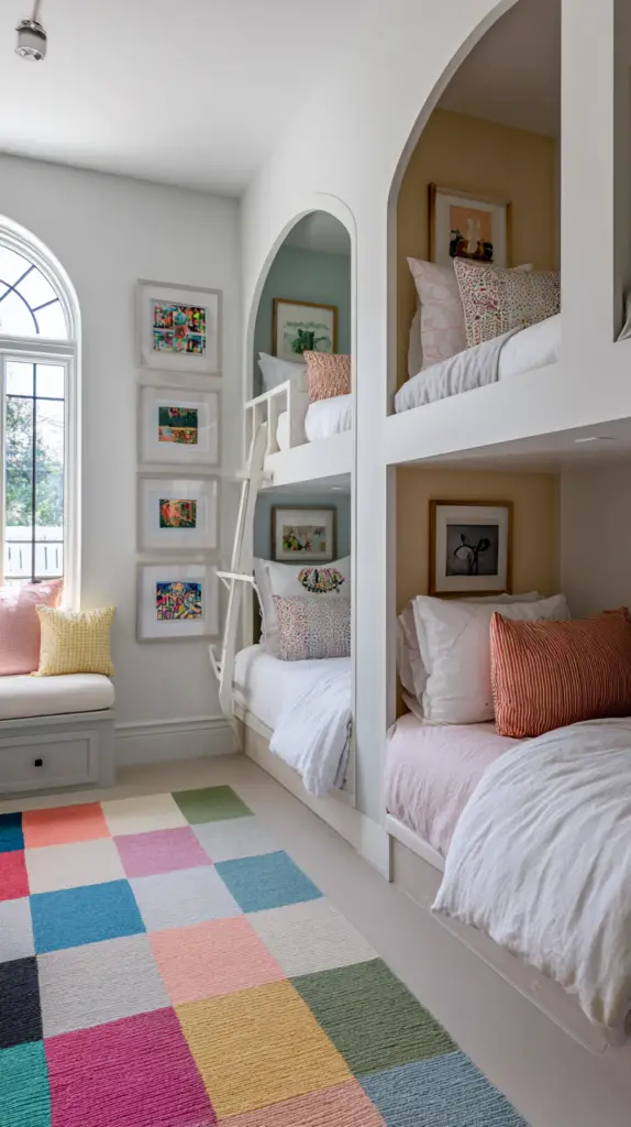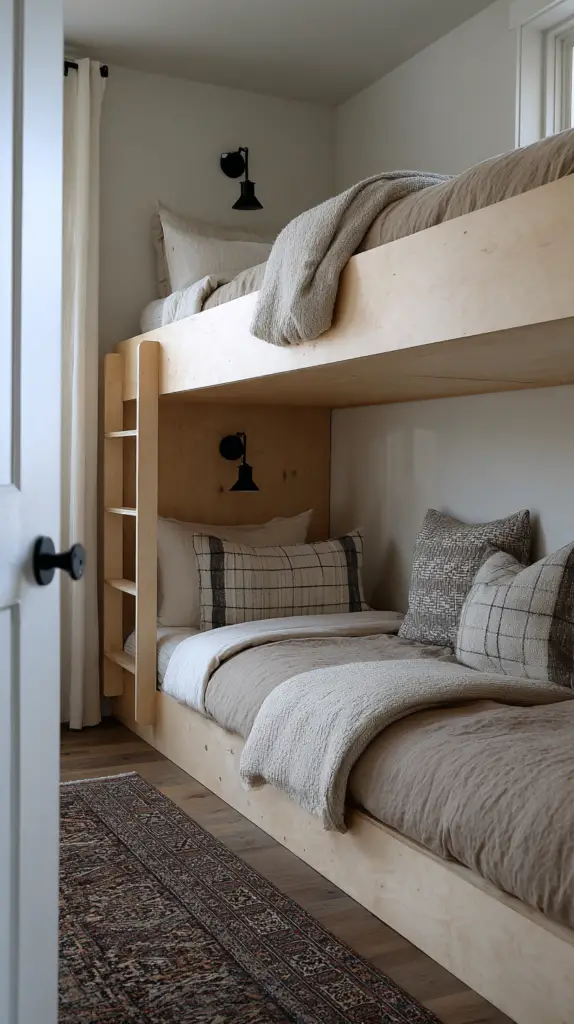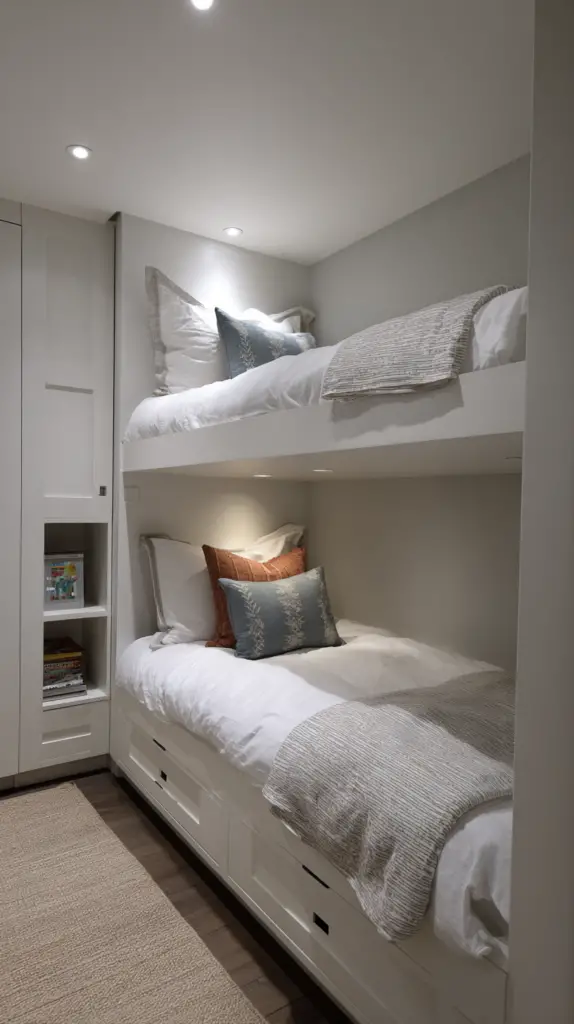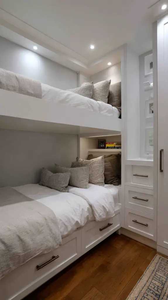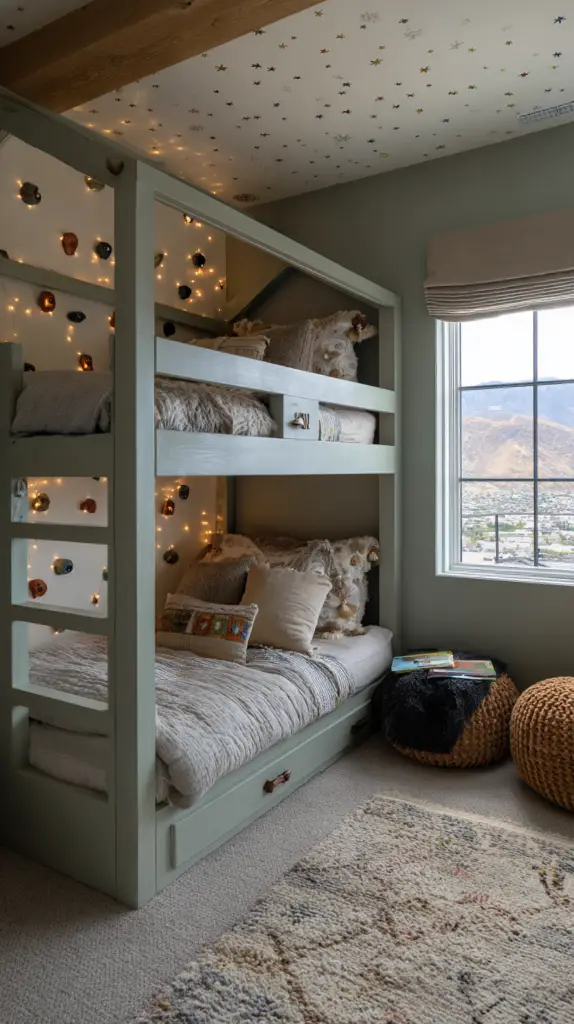 Customize the fort with soft mats, bean bags, or blankets to make it extra inviting. This hidden nook is not only fun but also promotes creativity and independent play. It’s a simple way to add a layer of intrigue and excitement to your bunk room design.