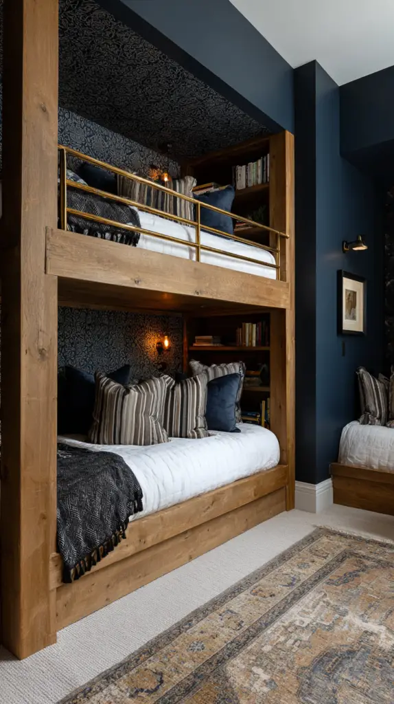 Use rich wood tones for the bunk frames to mimic a classic ship’s design, and choose blue or white accents for a maritime color scheme. Porthole windows can be purely decorative or functional, depending on the design. It’s a perfect theme for young explorers and ocean lovers.