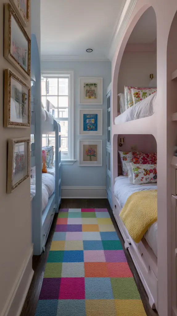 This idea works beautifully in larger bunk rooms where there’s enough space between beds. Select colors and patterns that coordinate with the room’s decor for a cohesive look. It’s a simple addition that adds loads of character and charm to the space.