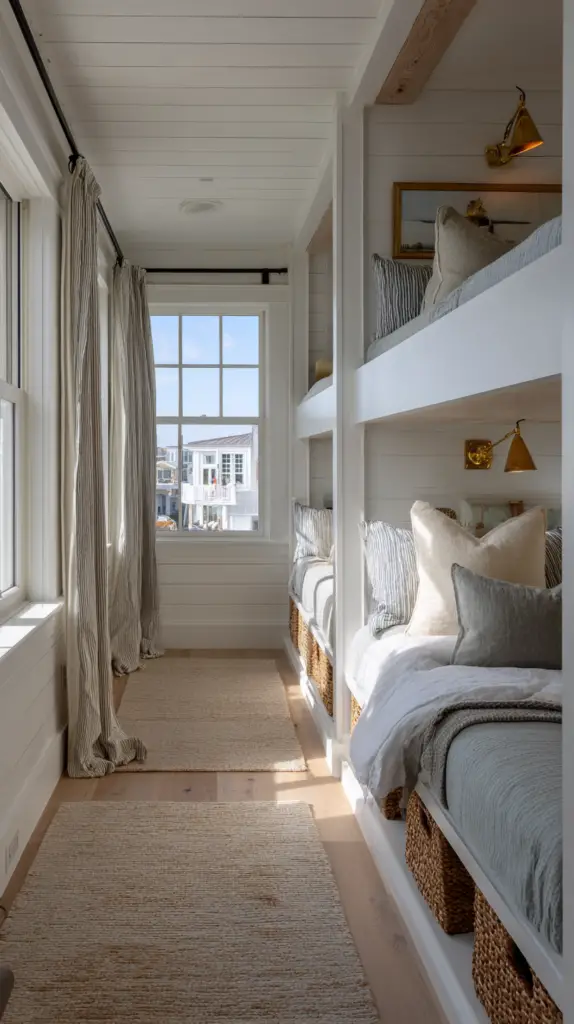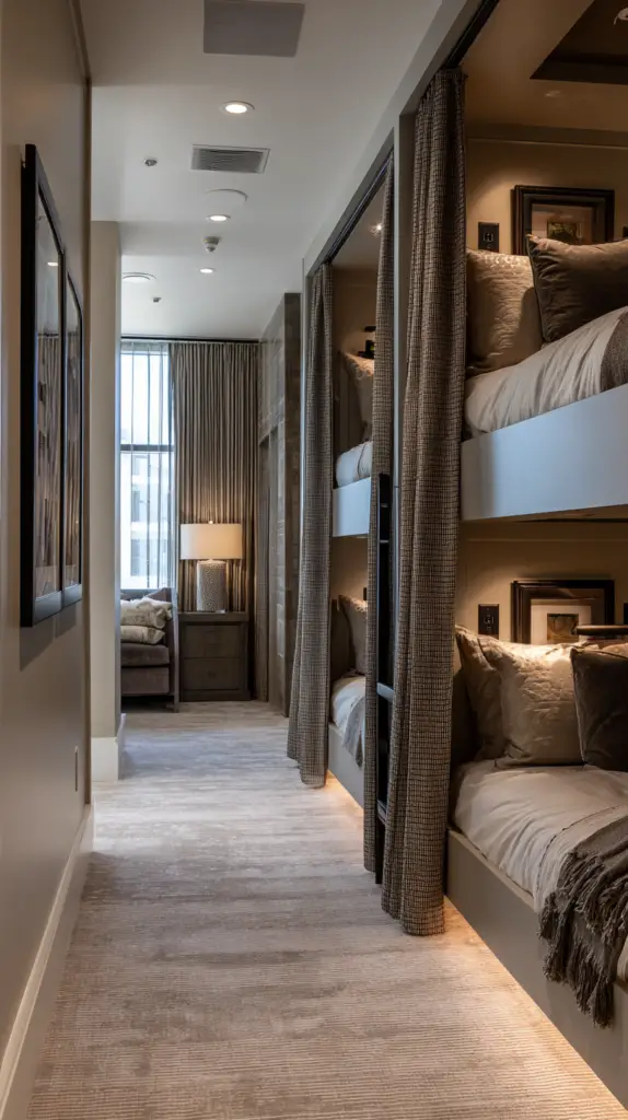Transform your bunk beds into cozy privacy pods by adding curtains to each sleeping area. These curtains create a personal retreat for each sleeper, offering a sense of security and reducing disturbances. Choose fabrics that complement the room’s style, from light sheers for a breezy look to heavier blackout curtains for better light control.