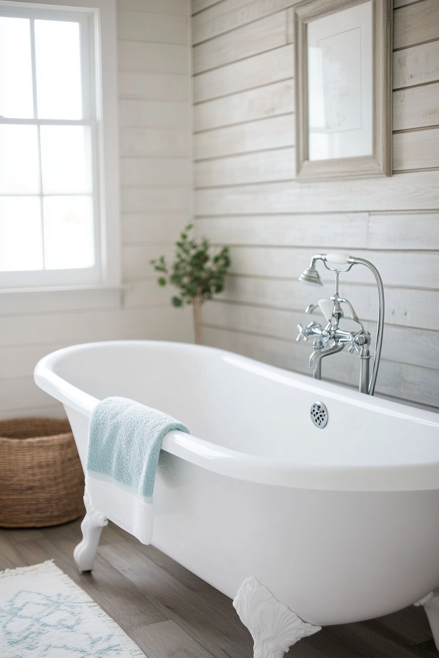 Create a warm and inviting bathroom with neutral-toned shiplap walls that showcase natural texture. Whether you choose soft beige, taupe, or ivory, this style is versatile and complements a variety of design elements.