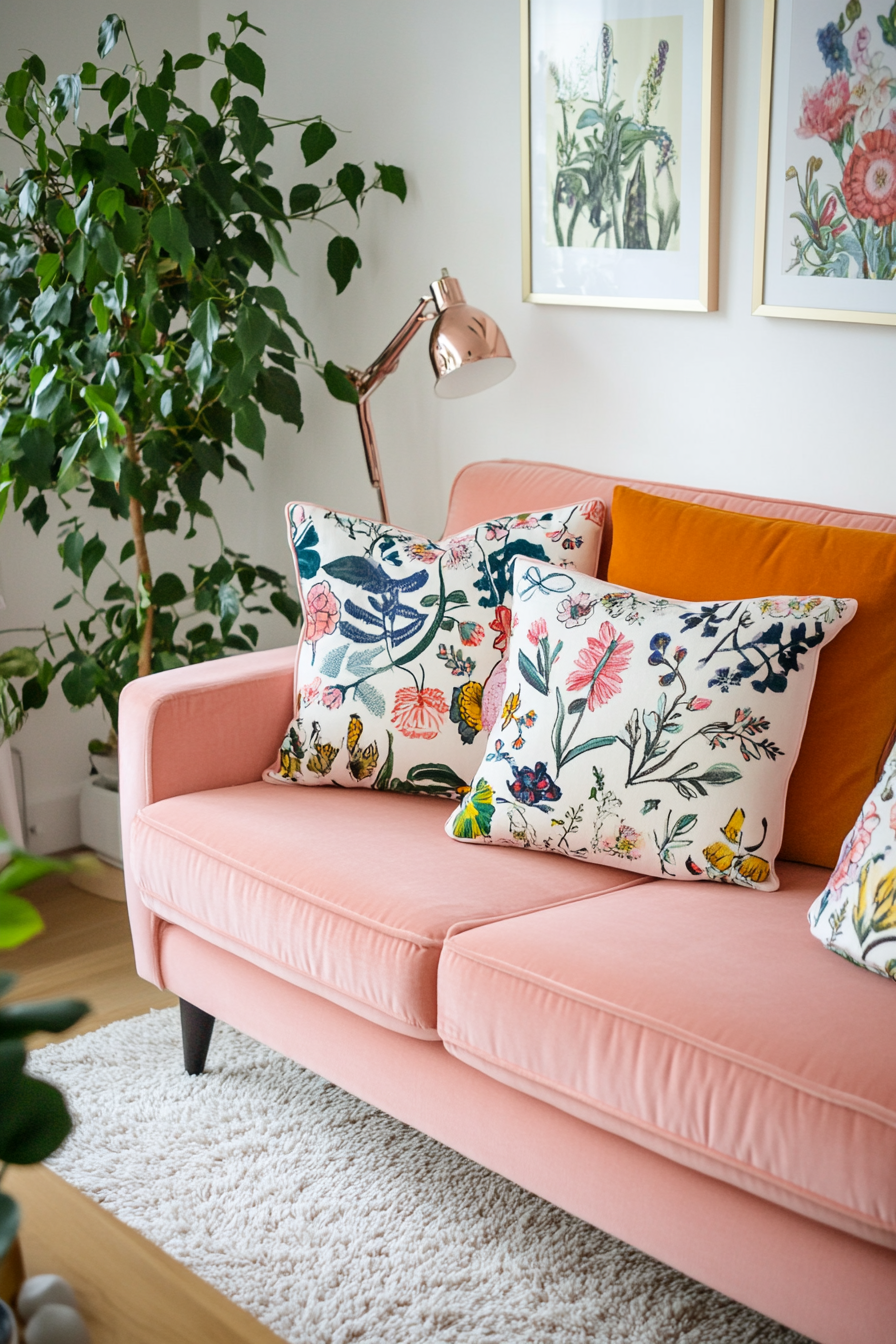 Decorate with floral patterns, abstract art, or ceramic vases in complementary tones. Greenery like potted plants or a bouquet of fresh flowers provides a refreshing contrast, making the pink pop without being overpowering.