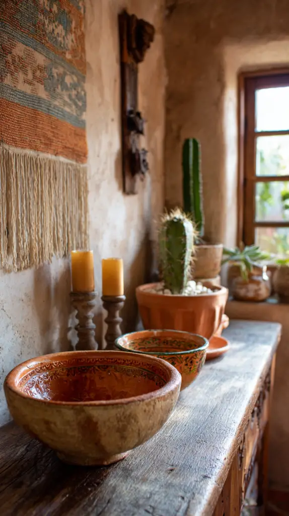 Accessorize with handmade pottery, ceramics, and metalwork. Choose items that reflect traditional Mexican designs, such as colorful Talavera pottery or hand-forged ironwork. Display these pieces prominently on shelves, tables, and walls to highlight their beauty and craftsmanship. These handcrafted details will give your home a warm, inviting feel and a touch of Mexican heritage.