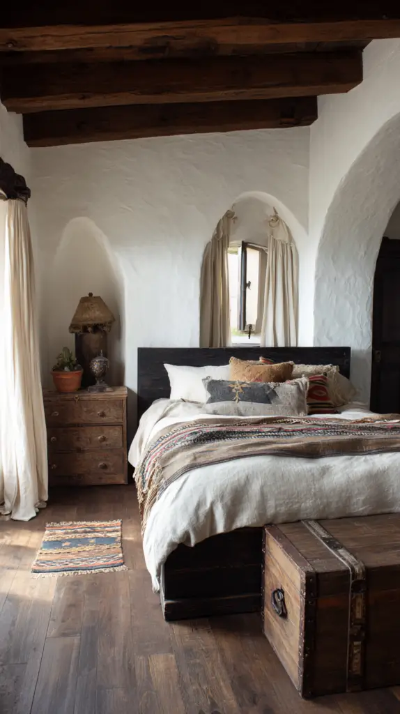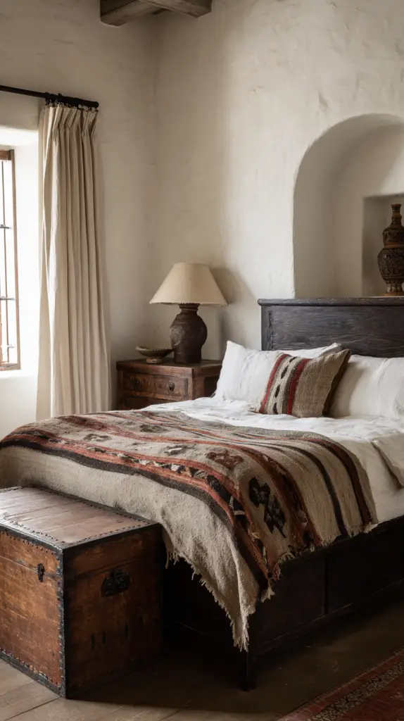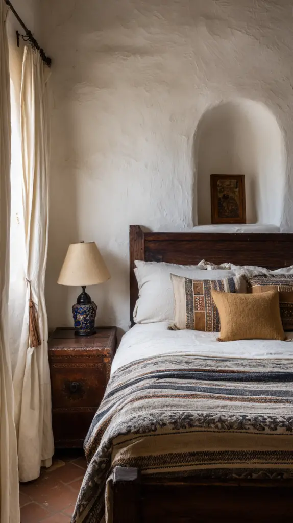 Complete your bedroom with decorative elements that reflect Mexican artistry. Hang folk art or framed Talavera tiles on the walls. Add a mix of ceramic vases and candles to create a cozy ambiance. Consider incorporating wrought iron elements, like a bed frame or wall sconces, to blend rustic farmhouse vibes with traditional Mexican craftsmanship.