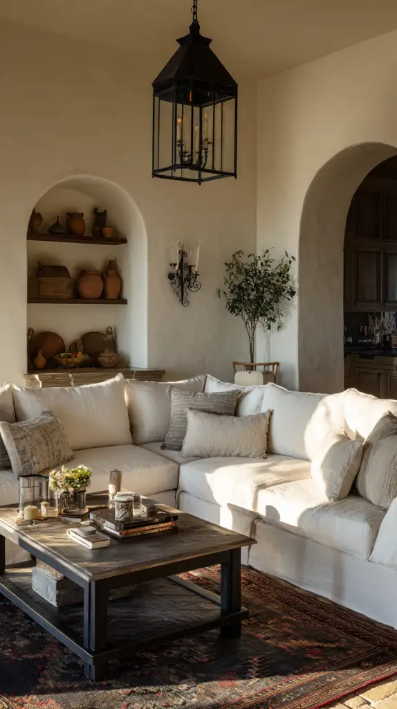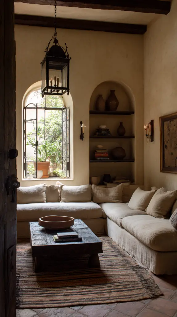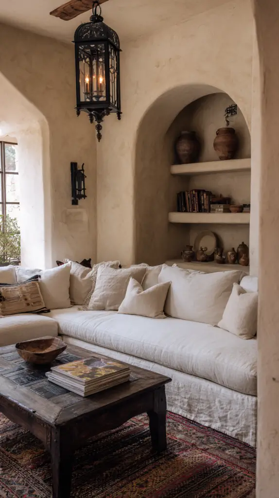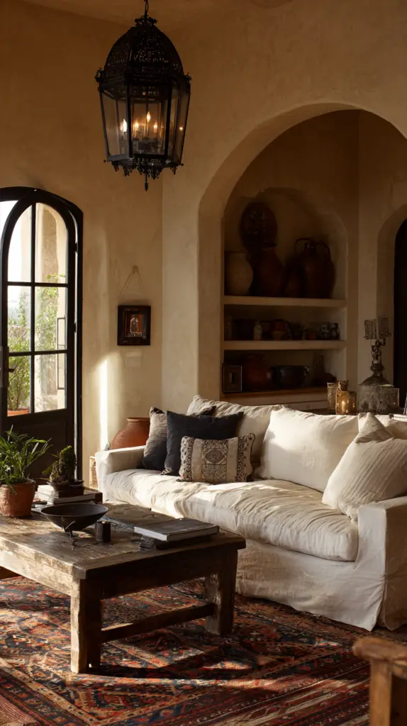 To bring the room to life, incorporate various textiles and materials. A large, handwoven rug with geometric patterns can anchor the space and add warmth. Use wall hangings and tapestries to infuse color and texture into the room. Finish with accents like wrought iron candle holders, framed artworks, and potted plants to enhance the overall atmosphere and make the space feel cozy and welcoming.