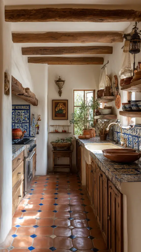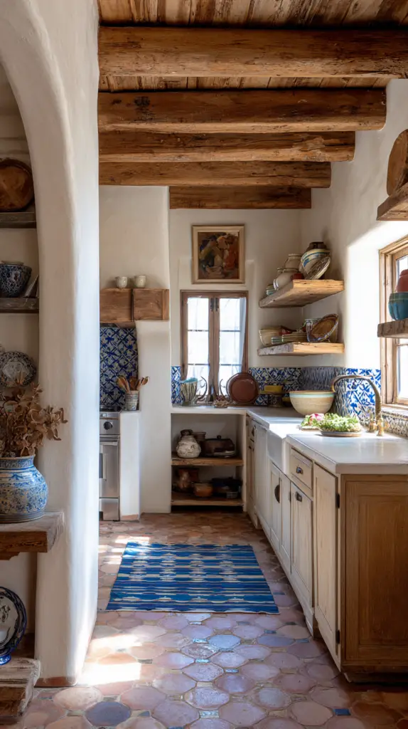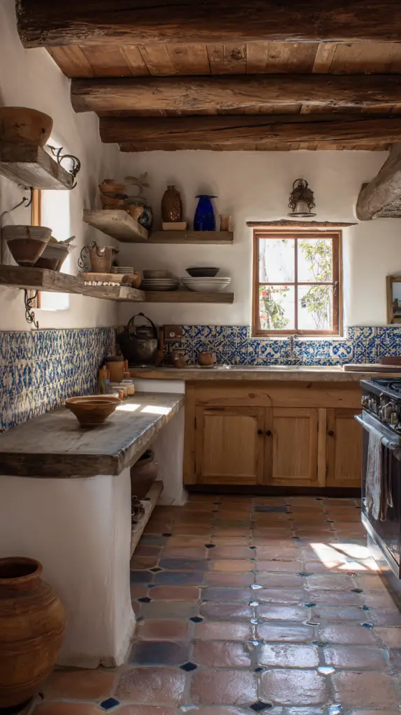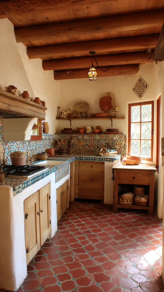 The kitchen is the heart of a Mexican farmhouse, where traditional elements meet modern functionality. Start with vibrant cabinetry painted in bold colors like turquoise, red, or yellow. Pair these with open shelves displaying beautiful Talavera pottery and rustic dishware. Consider installing a colorful, hand-painted tile backsplash to infuse the space with Mexican flair.