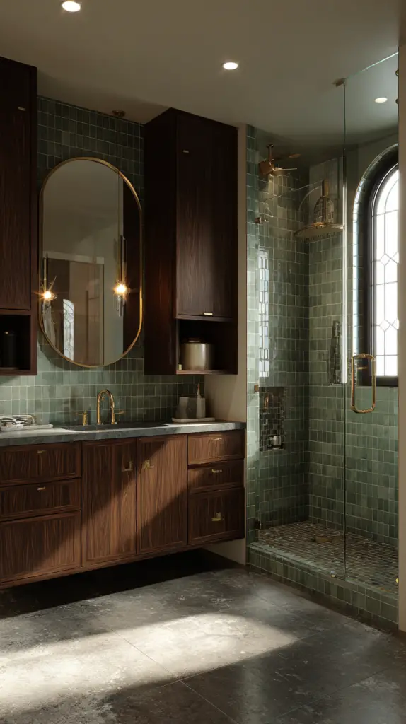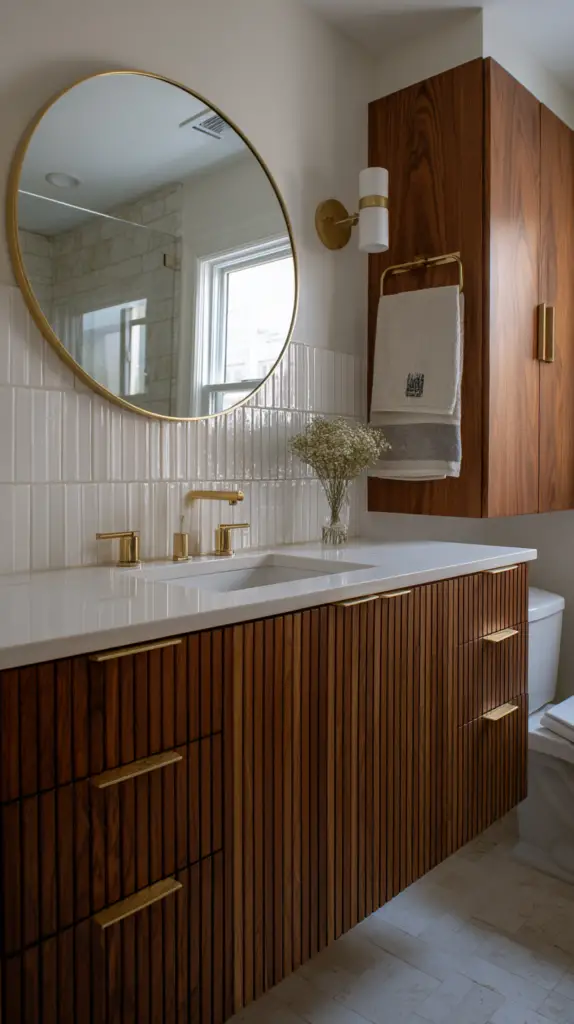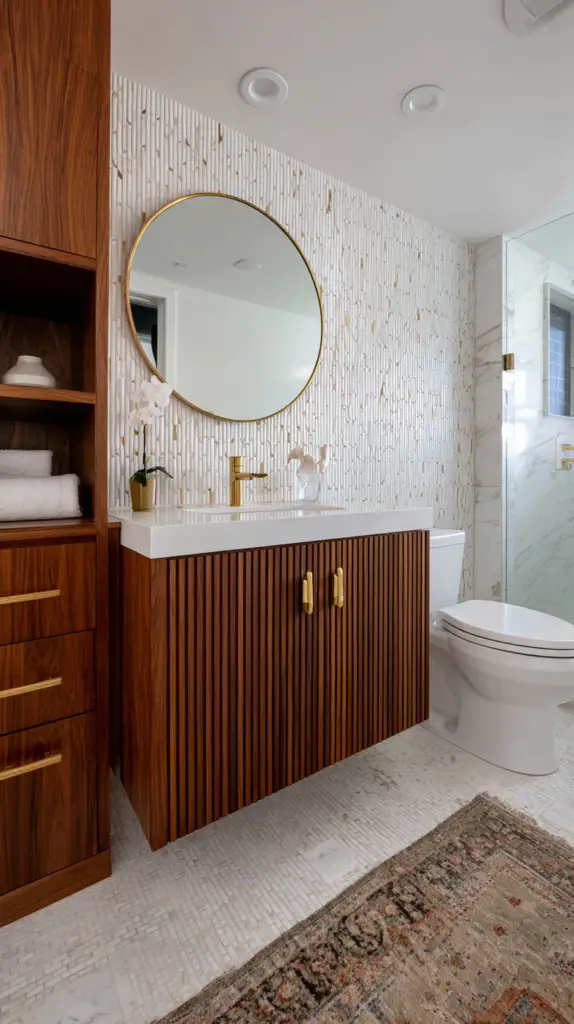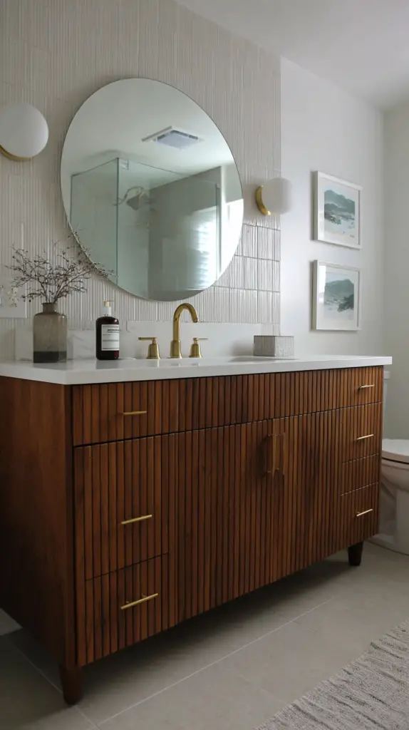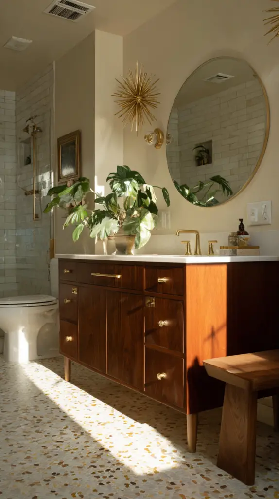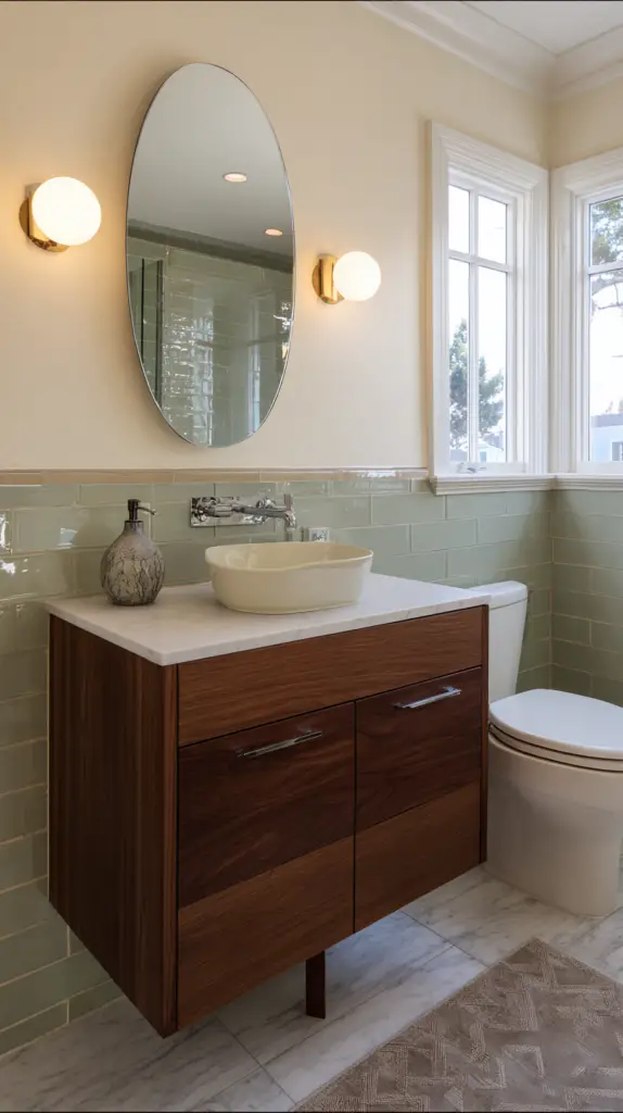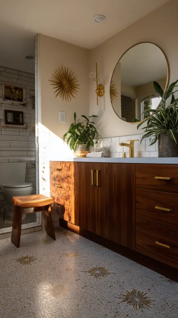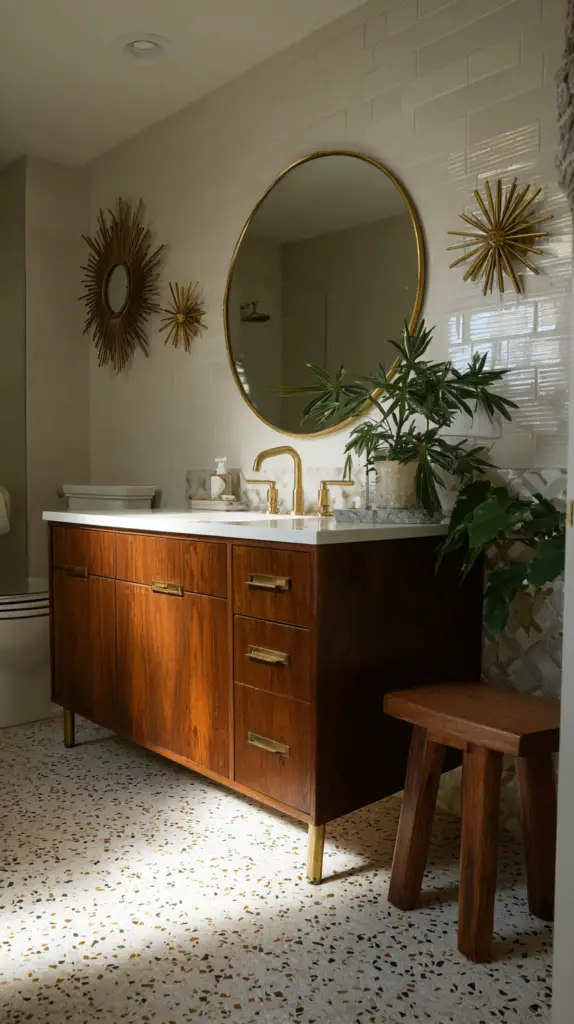 Mirrors are not just functional but also a significant design element in a Mid-Century Modern bathroom. Choose mirrors with clean lines, geometric shapes, and minimalist frames. Round or oval mirrors are particularly popular in mid-century design, adding a soft, organic touch to the bathroom’s sharp, clean lines. For a more dramatic effect, consider a mirror with a starburst or sunburst frame, a quintessential mid-century motif.