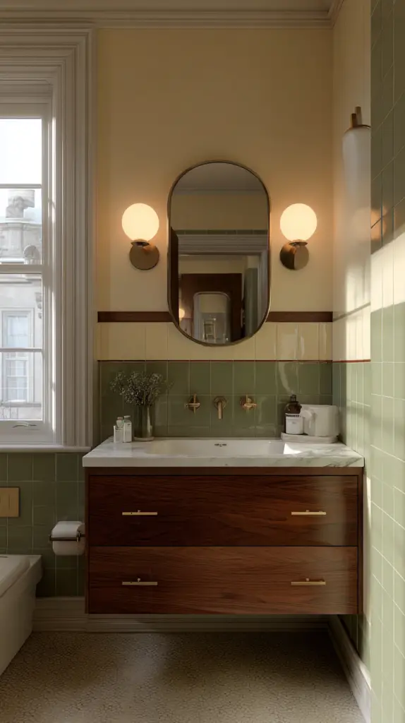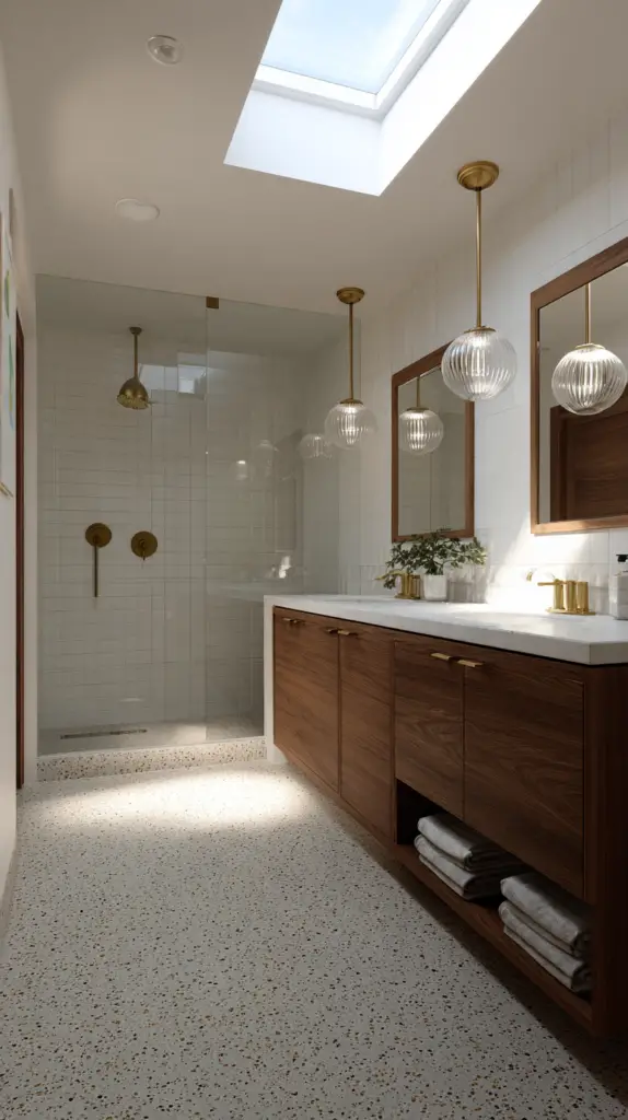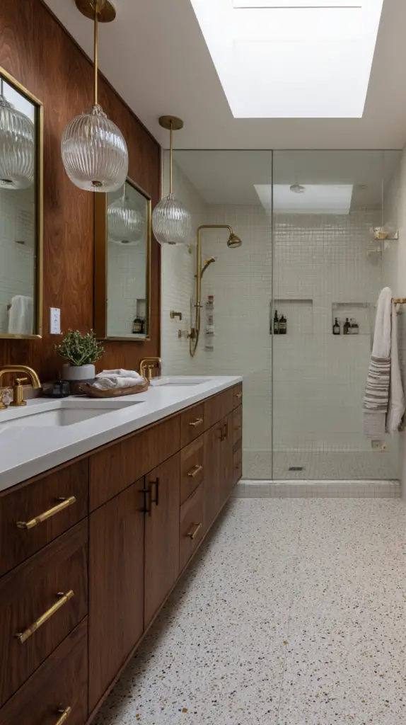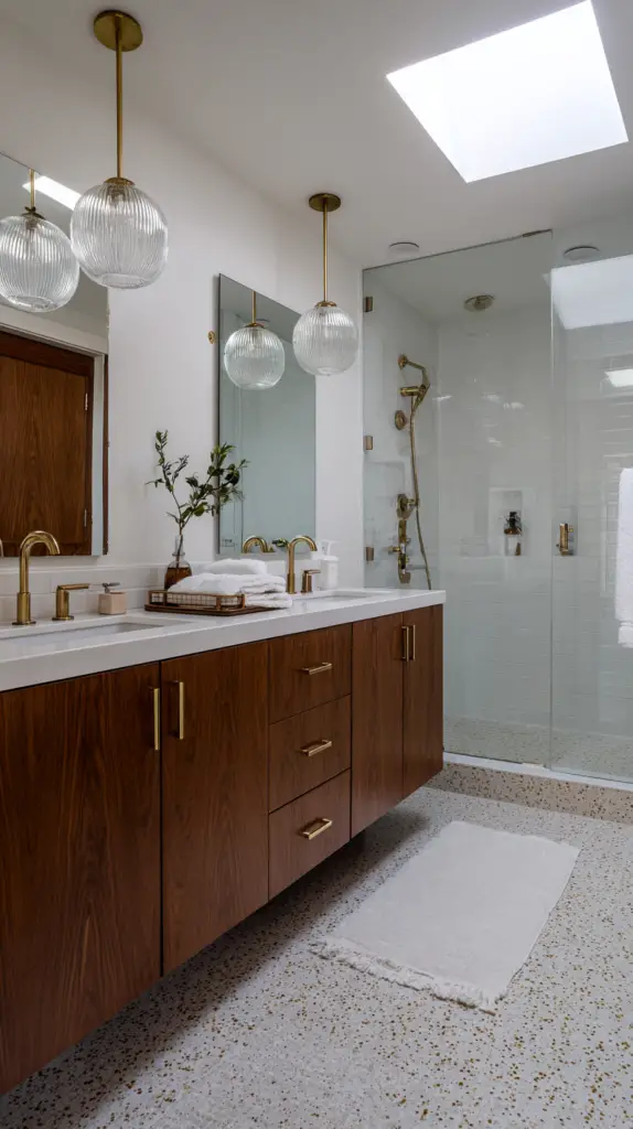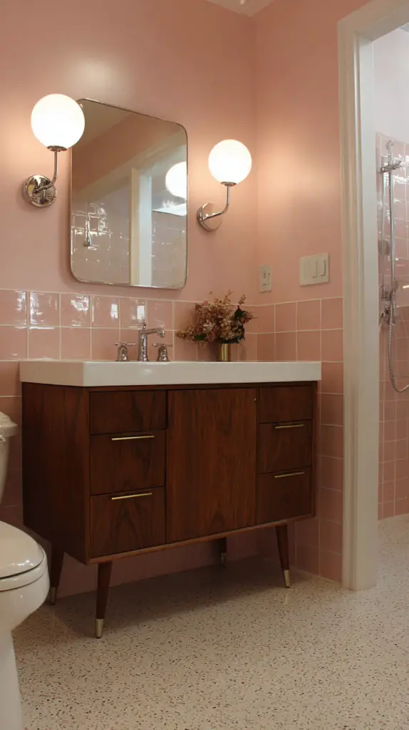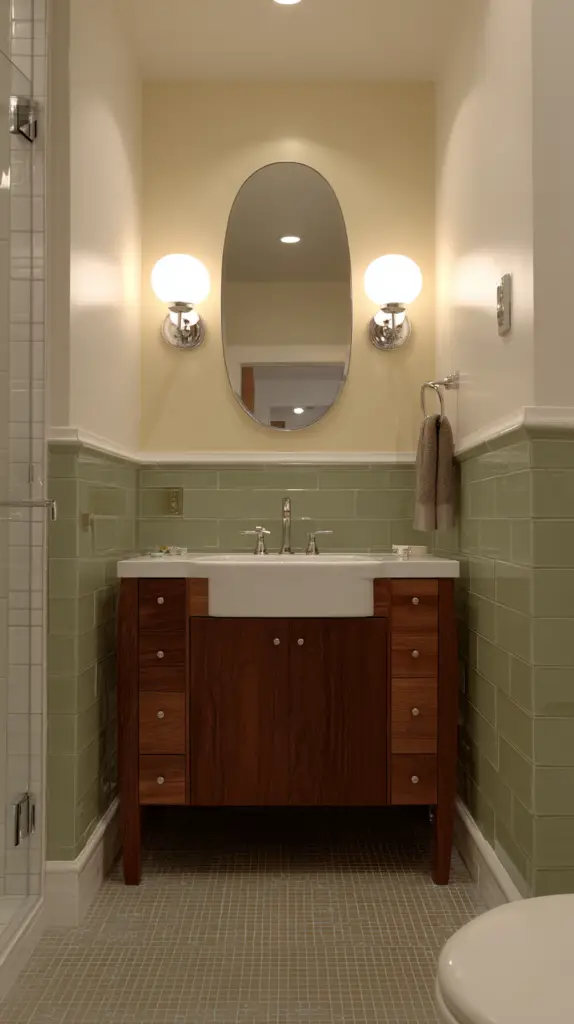 To enhance the mid-century vibe, opt for fixtures in materials like brass, chrome, or matte black. These finishes not only complement the era’s aesthetic but also pair well with other elements in the bathroom, such as faucets and hardware. Choose bulbs with a warm glow to create a cozy, welcoming ambiance that reflects the comfort and style of the mid-century era.