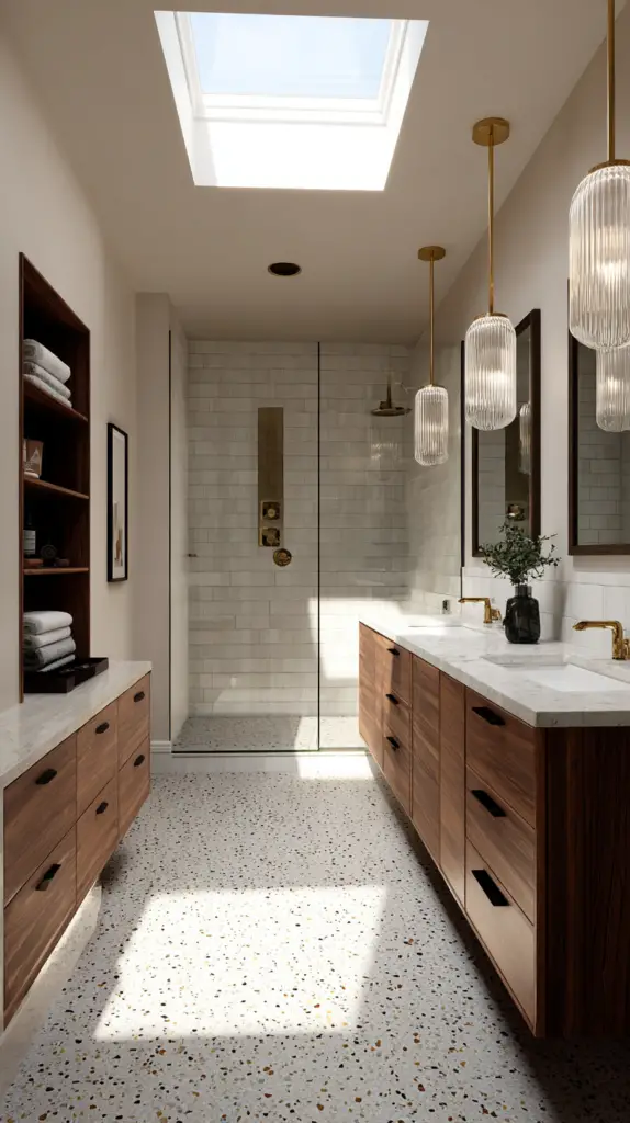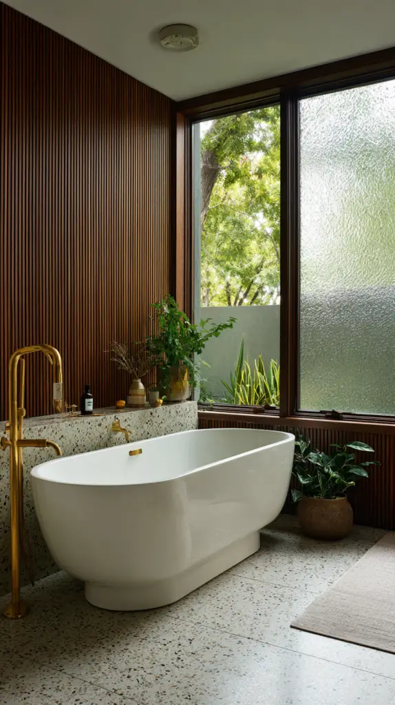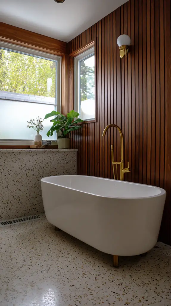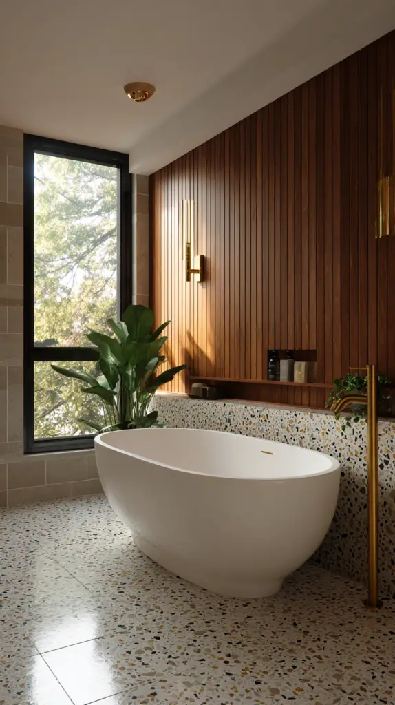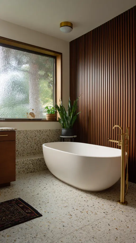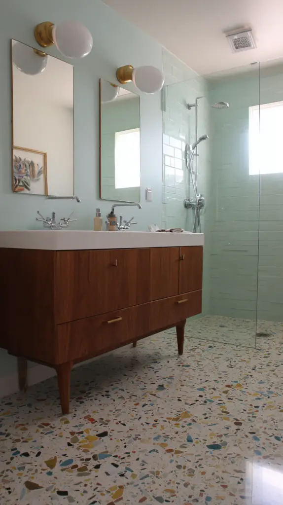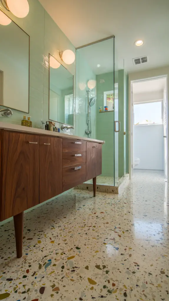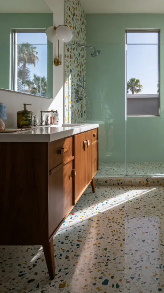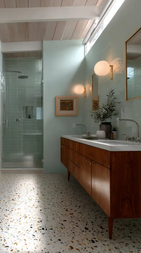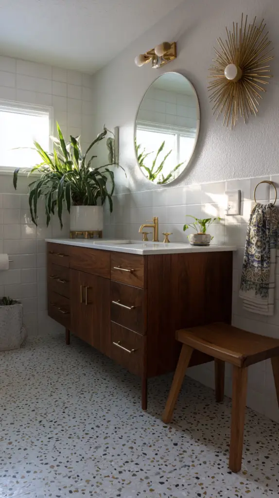 The flooring in a Mid-Century Modern bathroom is a great place to incorporate bold patterns and materials. Terrazzo tiles are a fantastic choice, with their speckled appearance that adds both texture and color. These tiles were hugely popular during the mid-century period and bring a retro yet timeless quality to any bathroom. Alternatively, go for large, geometric tiles that can create a striking visual statement on the floor.