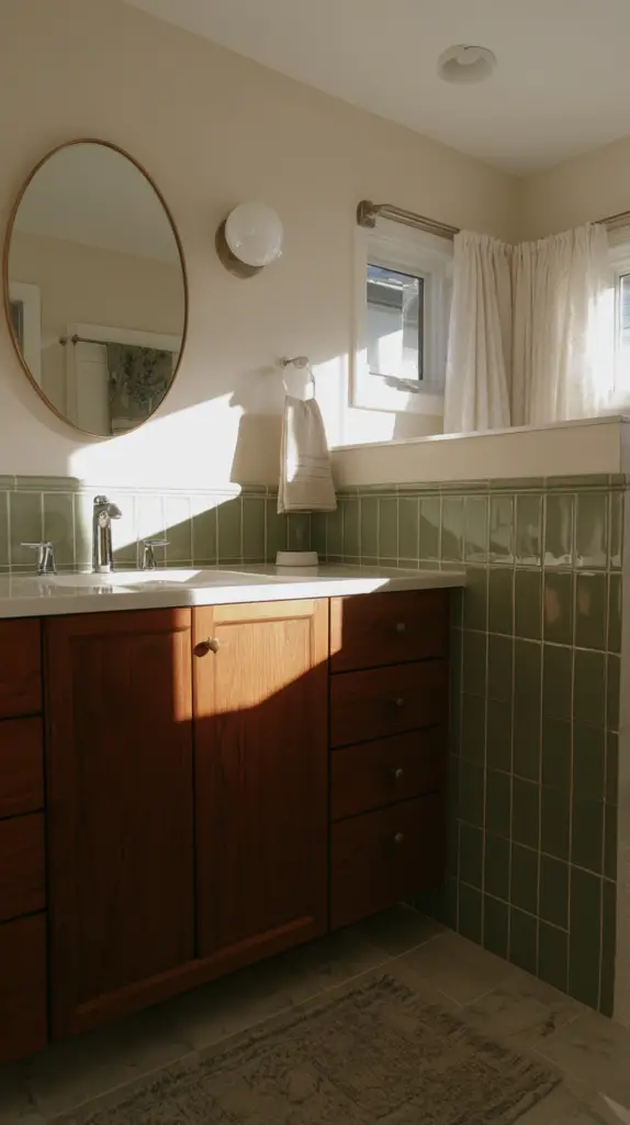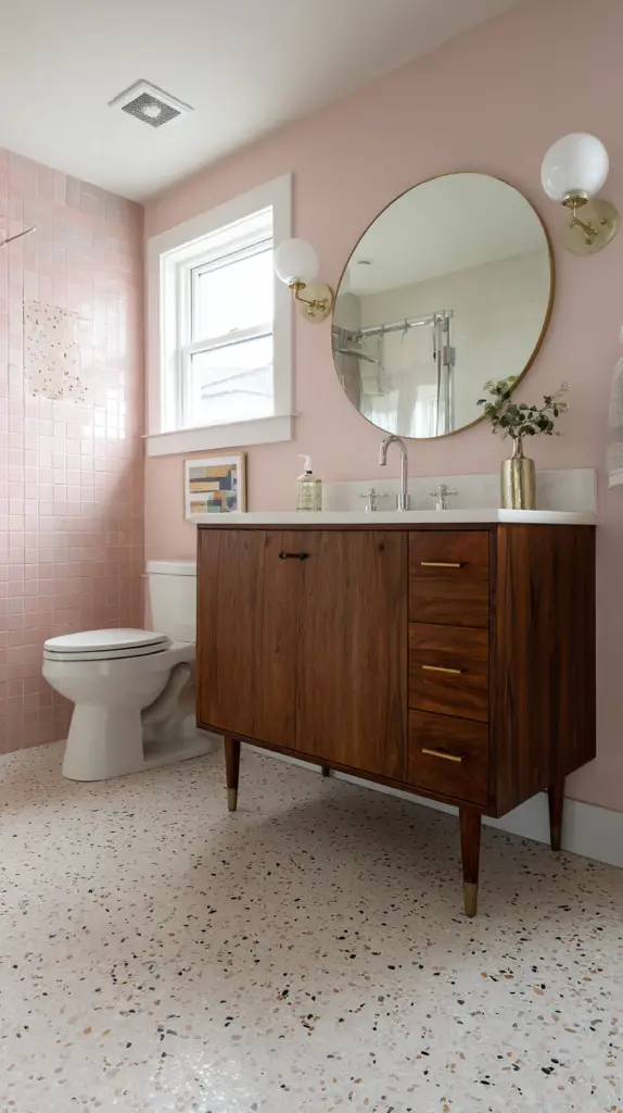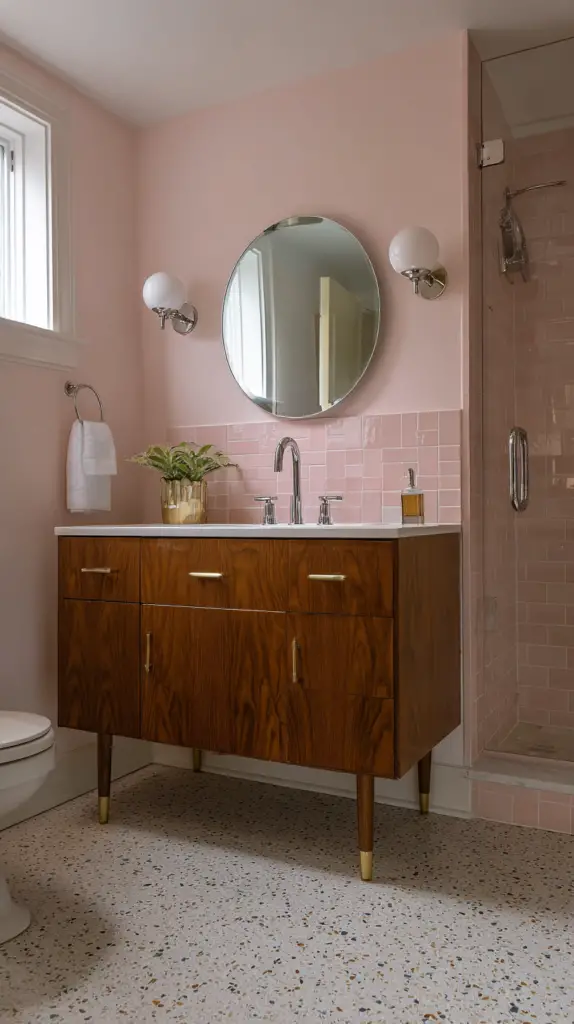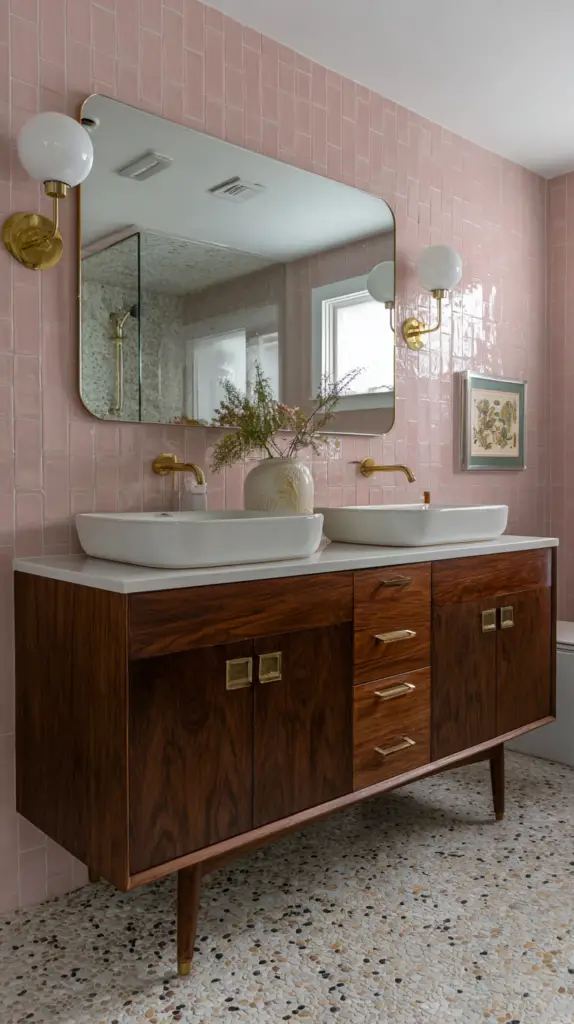 Frameless mirrors also work well, especially when paired with bold, patterned wallpaper or intricate tile work. They allow the other design elements to take center stage while providing a sleek, modern look. If you prefer a framed mirror, opt for materials that complement the mid-century aesthetic, such as wood, metal, or even rattan for a boho twist.