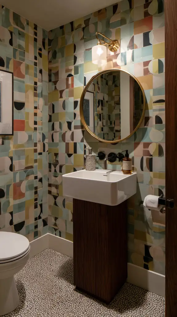 To balance the dynamic patterns of the wallpaper, keep the rest of the bathroom decor simple and understated. Pair with solid-colored tiles, neutral fixtures, and minimalist accessories. This approach ensures that the wallpaper remains the focal point, creating a cohesive and stylish look that embodies the essence of mid-century design.
