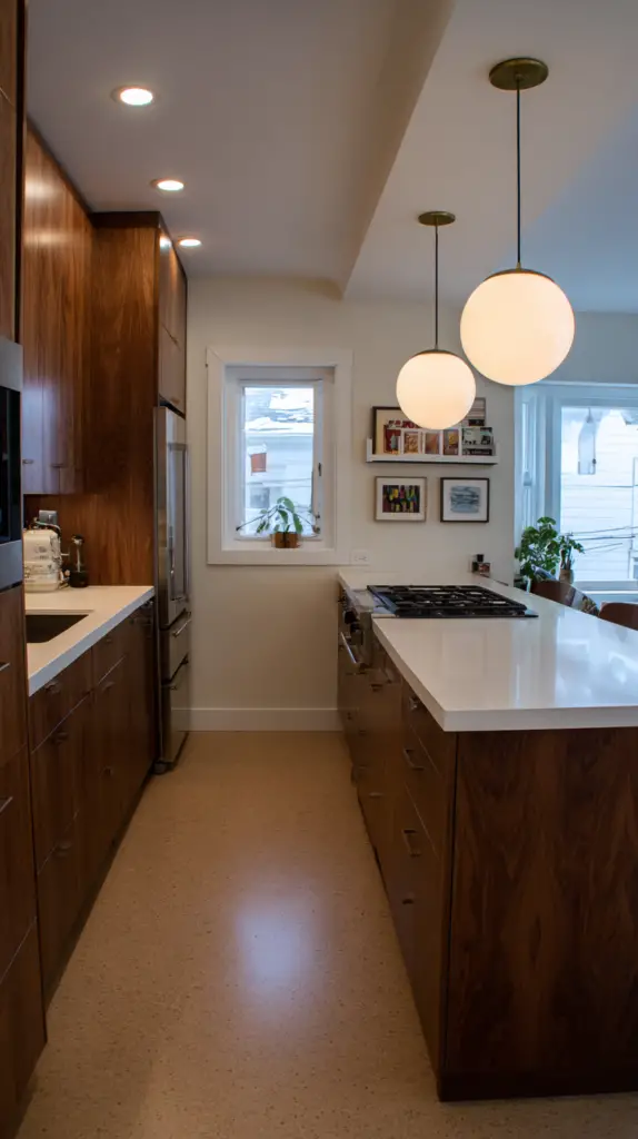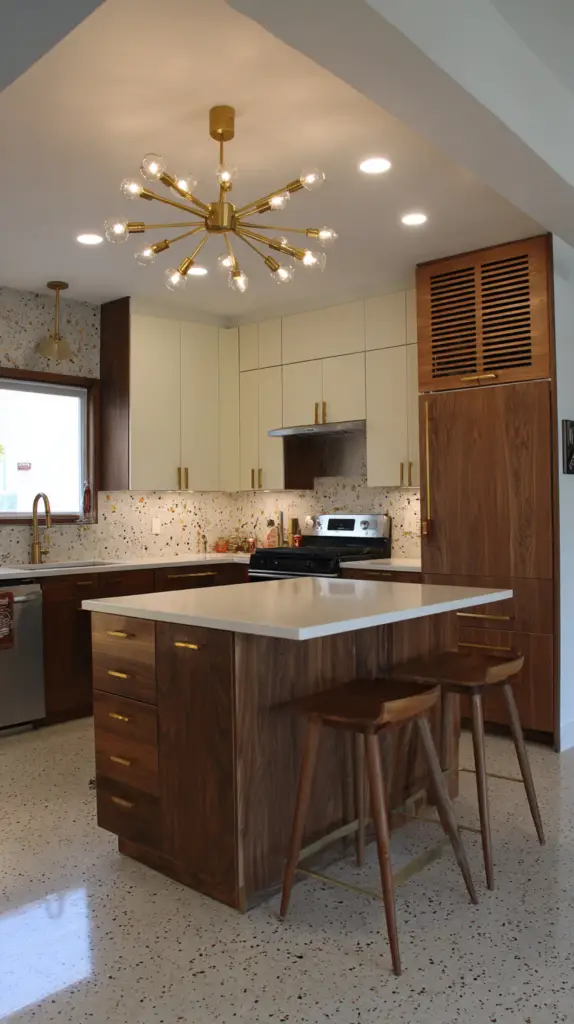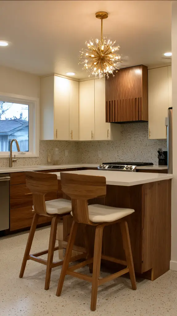 To add a touch of retro flair, choose light fixtures with a vintage-inspired design. Sputnik chandeliers, with their starburst shape and multiple arms, are iconic to the mid-century modern era and make a bold statement. Alternatively, globe pendant lights in frosted or clear glass can provide a softer, more diffuse light that complements the streamlined design of your kitchen.