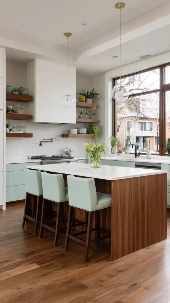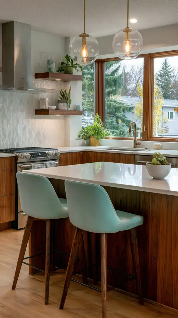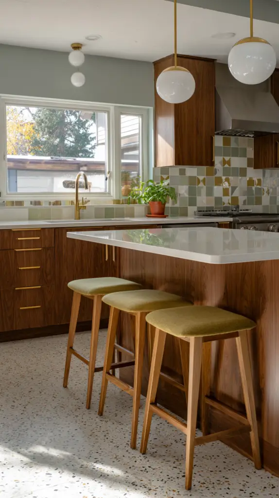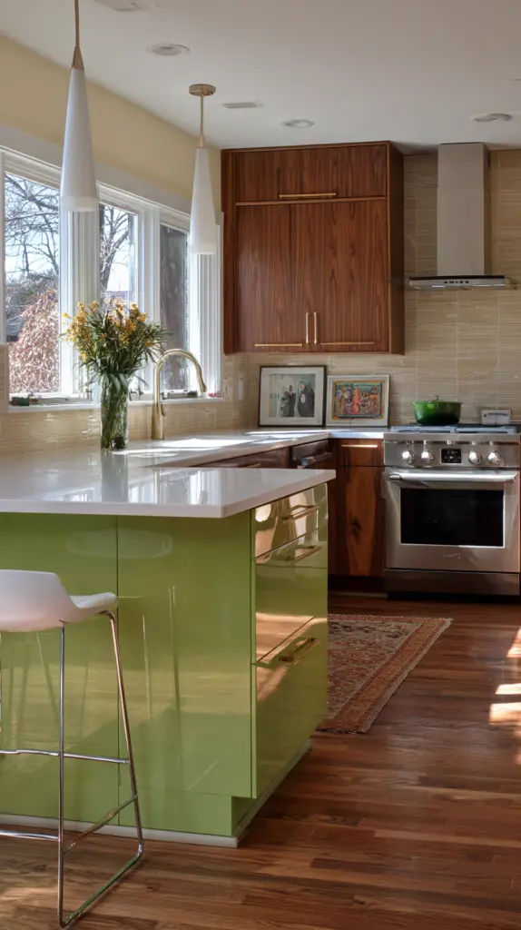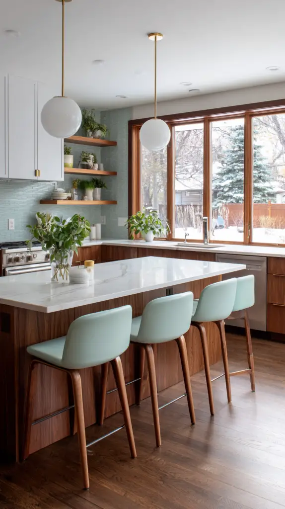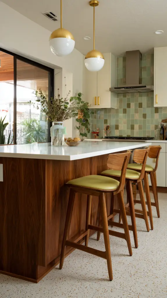 In addition to living plants, consider using green as a color in your kitchen’s design. This could be through cabinetry, backsplash tiles, or even small appliances. Shades of green, from soft sage to bold emerald, work well with the wood tones and neutral bases typical of mid-century modern design. Green can bring a fresh, natural element that complements the clean lines and geometric patterns.