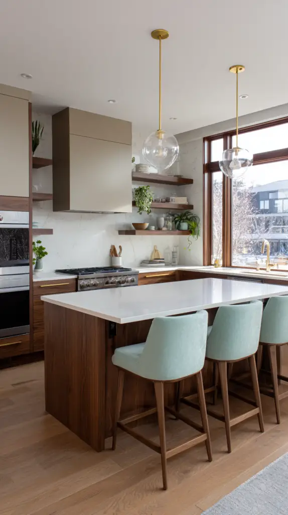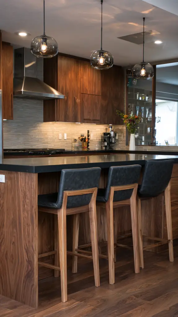 Wood and natural materials play a significant role in mid-century modern design, adding warmth and texture to your kitchen. Choose cabinetry, countertops, or furniture that features natural wood finishes like walnut, teak, or oak. These materials not only provide a rich, organic feel but also complement the clean lines and minimalist aesthetic of the style.