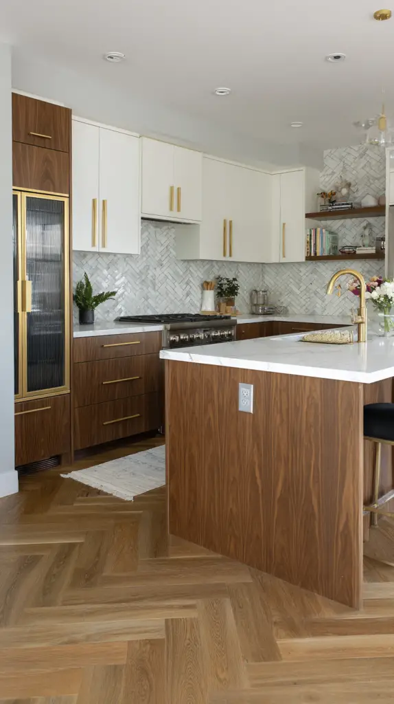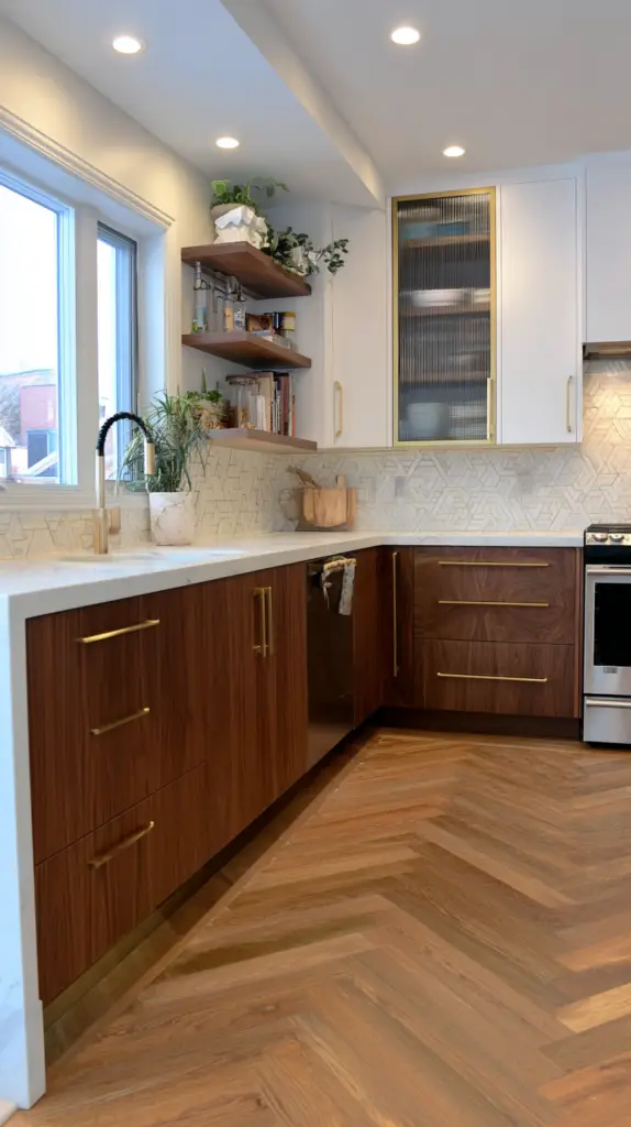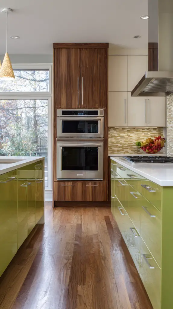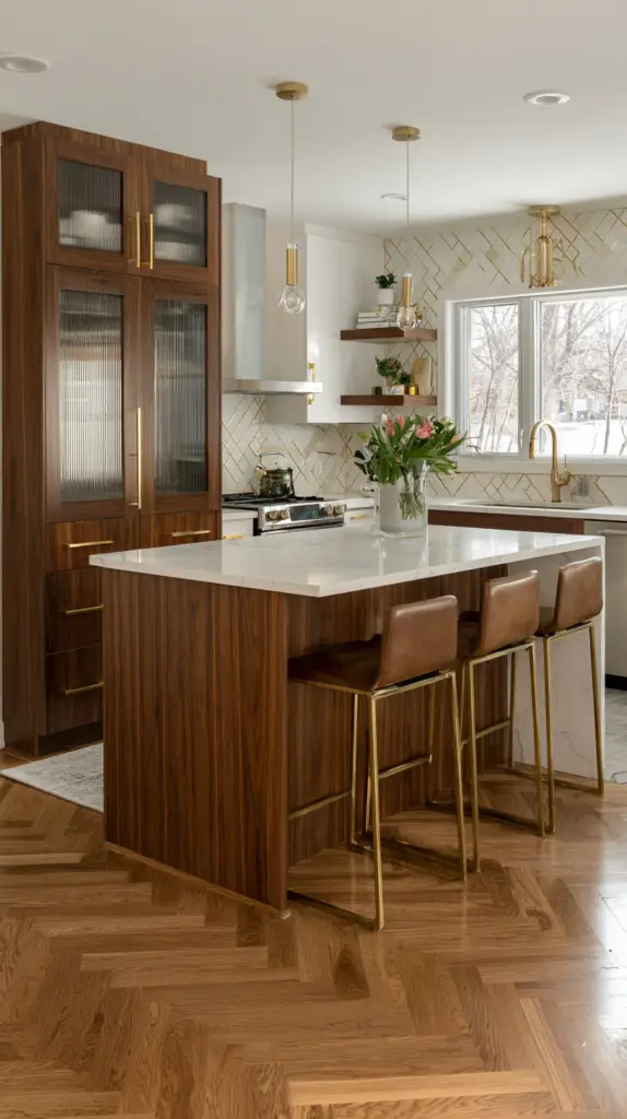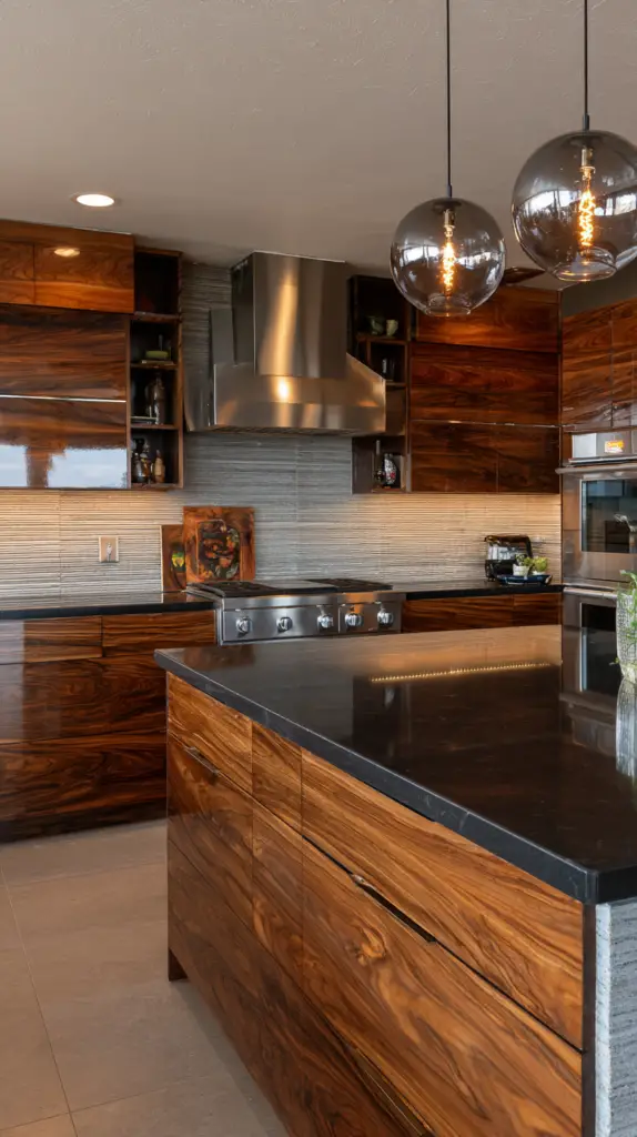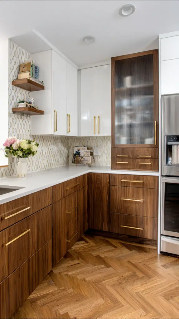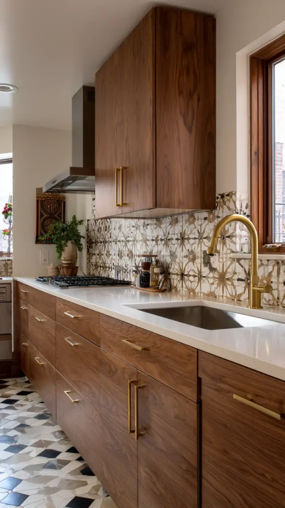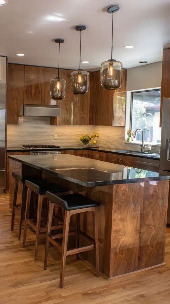 - Sleek Cabinets: Opt for flat-panel or slab-door cabinets in warm wood tones like teak, walnut, or even bamboo. These materials bring warmth and natural beauty into your kitchen.