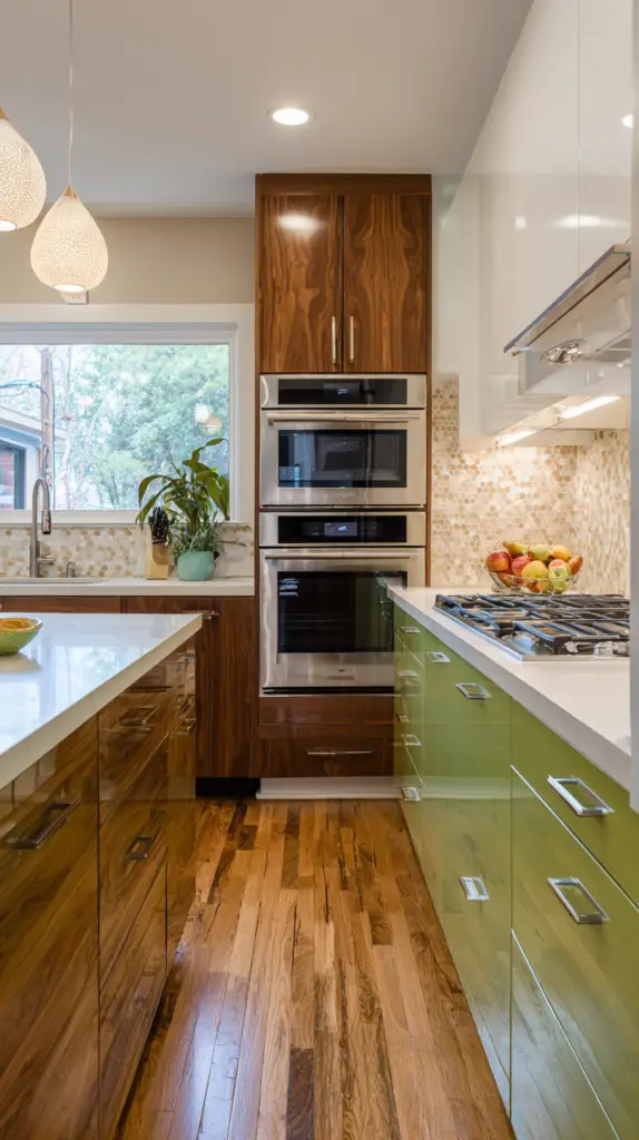 Mid-century modern design is known for its bold use of color. Don’t be afraid to experiment with vibrant hues in your kitchen. Incorporate colors like mustard yellow, burnt orange, teal, or avocado green to create a lively and dynamic space. These colors can be used on cabinets, walls, or as accents through appliances and accessories.