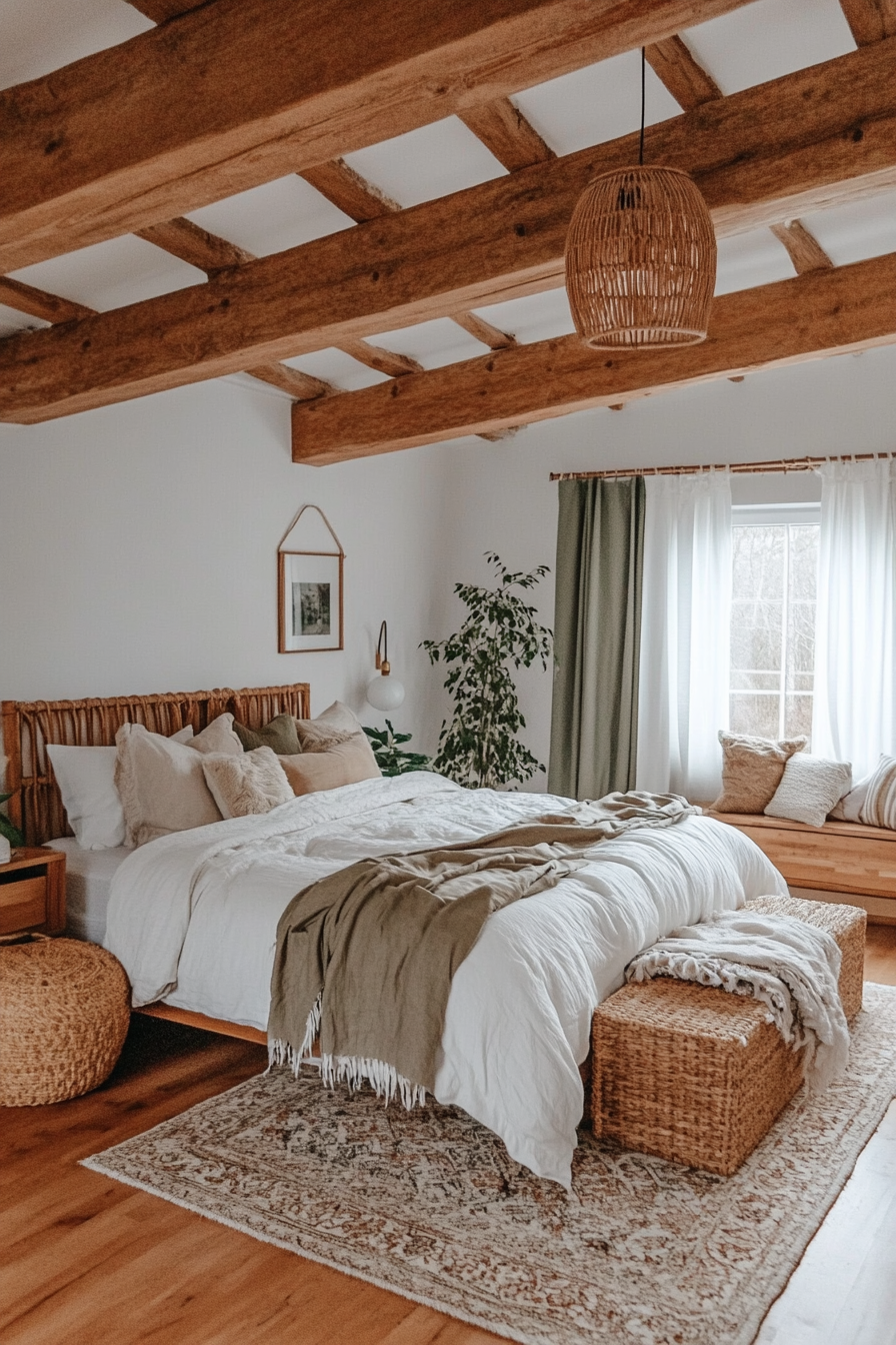 - Highlight natural finishes: Keep the wood beams untreated or lightly stained for a rustic look.